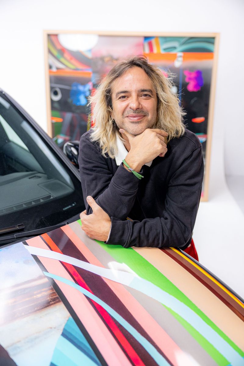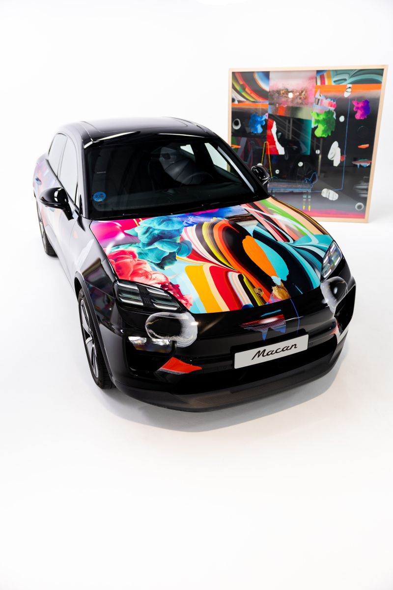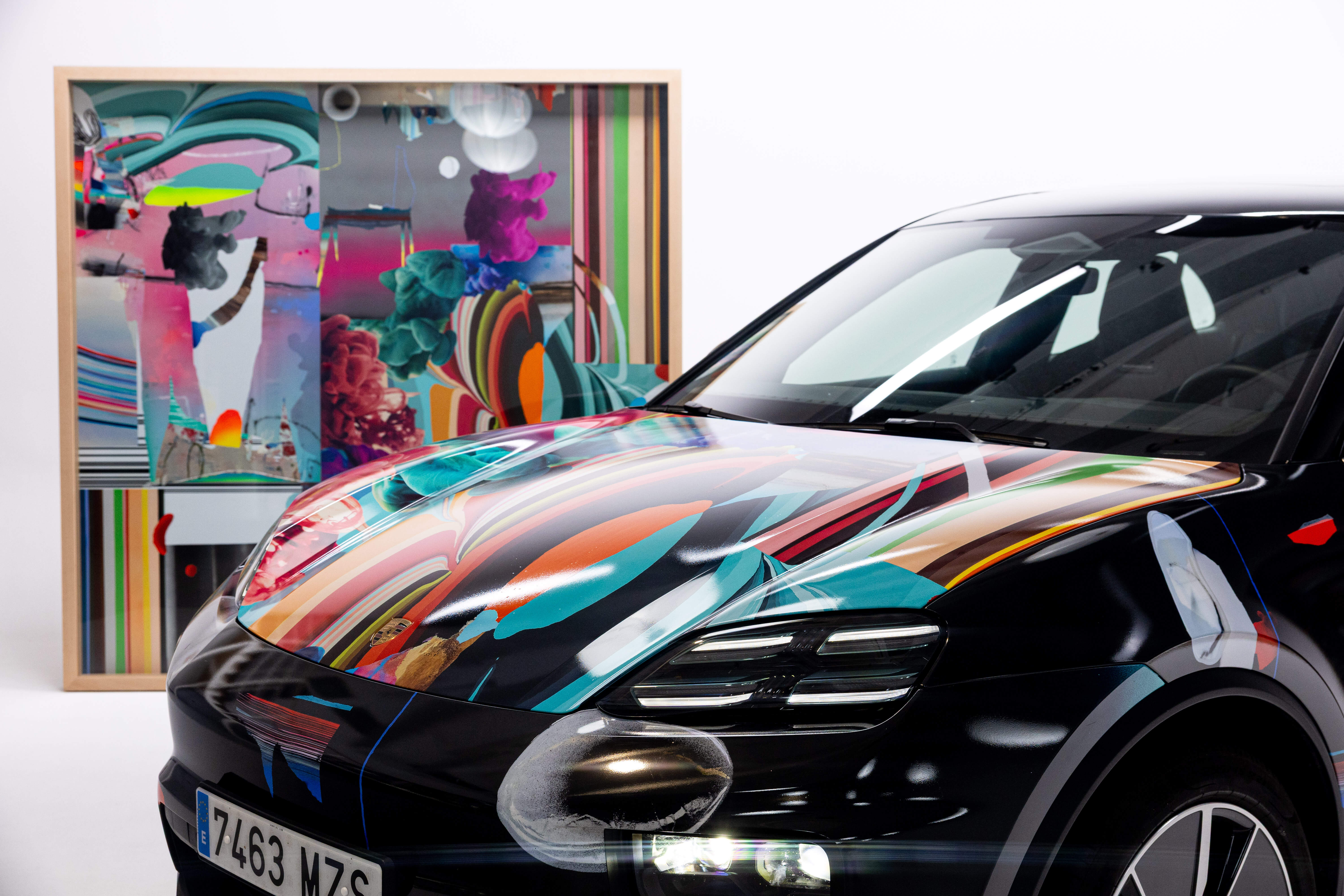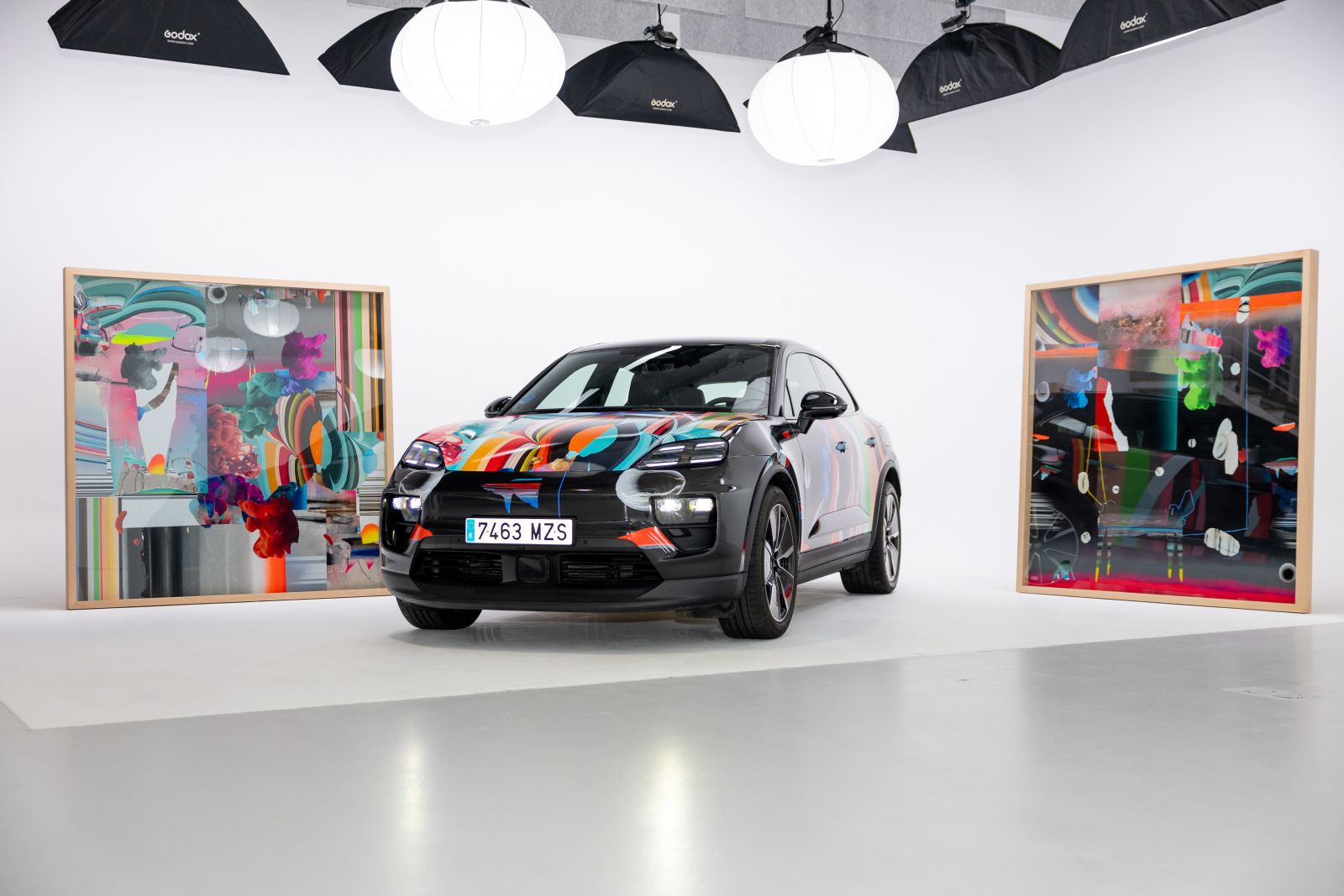Unos días después, esa relación entre arte y movimiento tomó una forma nueva con la colaboración de Porsche Ibérica con Kike Garcinuño, artista madrileño cuya obra fusiona el arte abstracto con el lenguaje urbano y digital. Garcinuño comenzó en el graffiti, pero su evolución técnica lo ha llevado a crear un universo propio, donde el óleo, el spray, el collage y las resinas se mezclan con materiales no convencionales. Su pintura es una exploración constante de la identidad, la emoción y la tensión entre lo humano y lo tecnológico. En esta ocasión, Garcinuño llevó su lenguaje al territorio Porsche: el resultado fue un Macan intervenido artísticamente como si se tratara de uno de sus cuadros, uniendo la energía del color con la pureza del diseño. La presentación se convirtió en una experiencia viva, una celebración del arte entendido como movimiento y de la ingeniería como lienzo.
