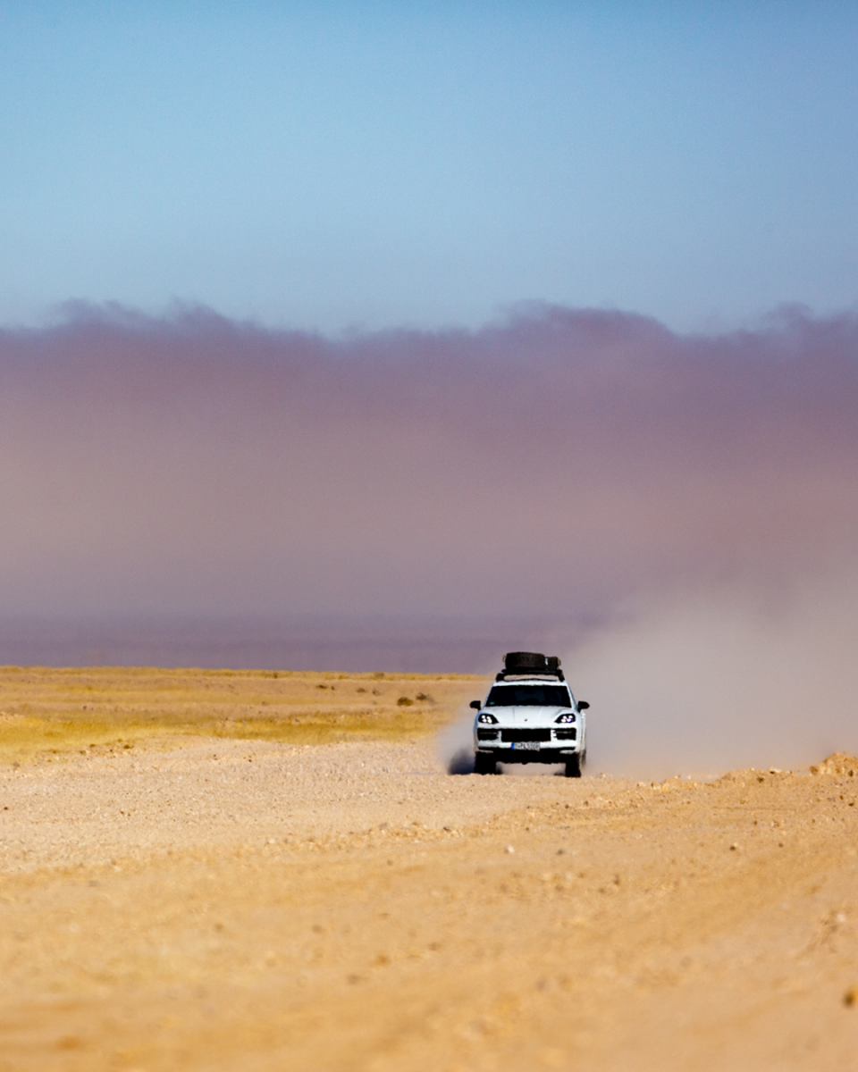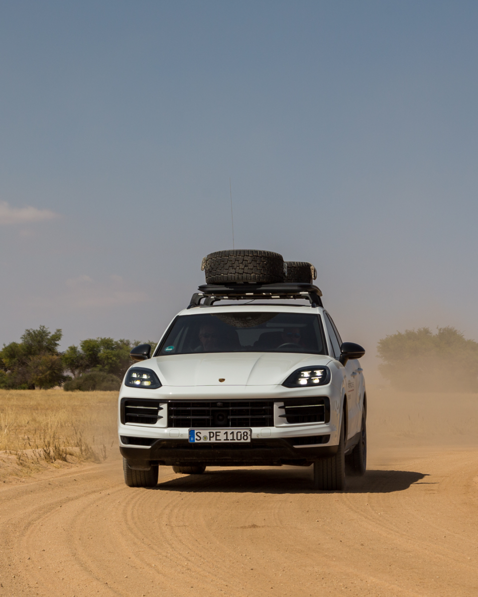 El viaje comienza en Windhoek, donde la tierra rojiza y el aire seco anuncian lo que está por venir. Desde el primer tramo, el Cayenne demuestra que el concepto SUV tiene otro significado cuando lleva el escudo de Zuffenhausen. Su tracción total, la suspensión activa y la dirección asistida por el sistema Porsche Active Suspension Management interpretan cada superficie con naturalidad. La arena, el polvo o la grava no son obstáculos, sino texturas de una misma experiencia. El coche se adapta, respira con el terreno y convierte cada movimiento en una expresión de equilibrio.