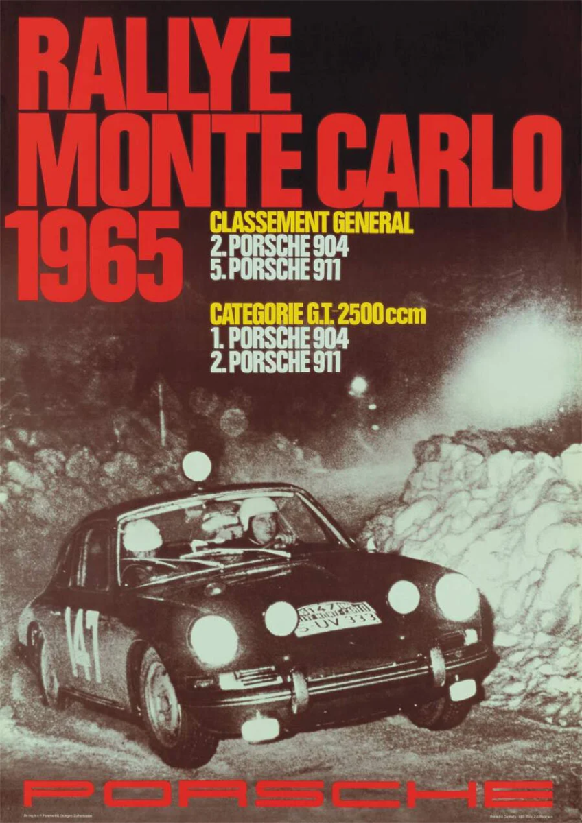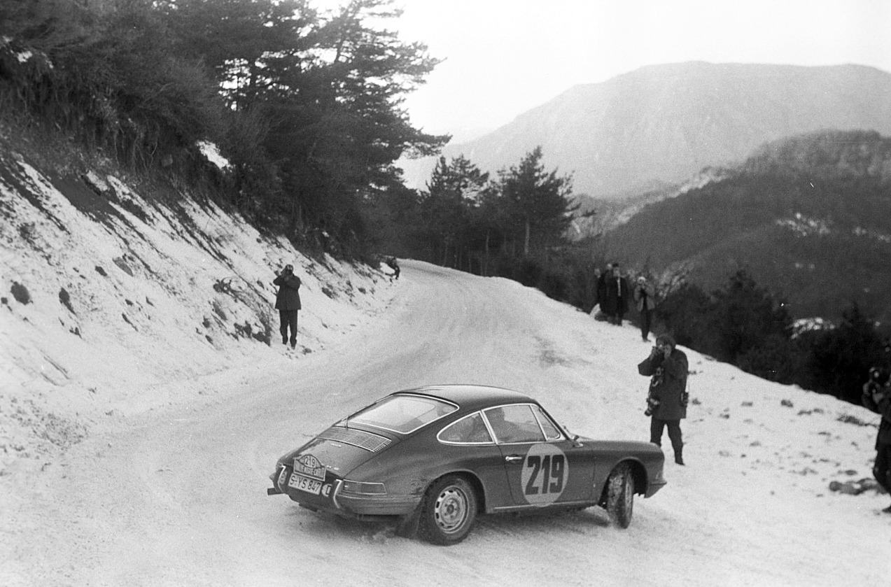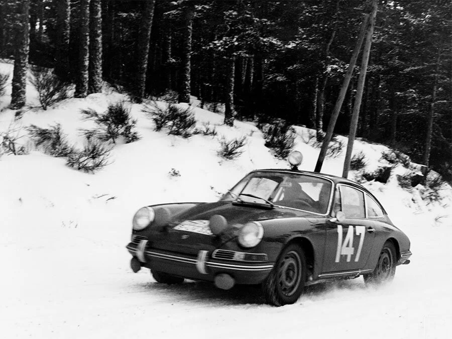 Ese mismo año se produjo también la primera gran aparición del Porsche 911 en Montecarlo. Apenas un año después de su presentación, el nuevo deportivo de seis cilindros se enfrentaba a uno de los rallies más duros del mundo. El coche número 147, pilotado por Herbert Linge y Peter Falk, cruzó la meta en quinta posición de la clasificación general. Más allá del resultado, aquella participación marcó el inicio de una historia que convertiría al 911 en uno de los protagonistas más reconocibles del rally.